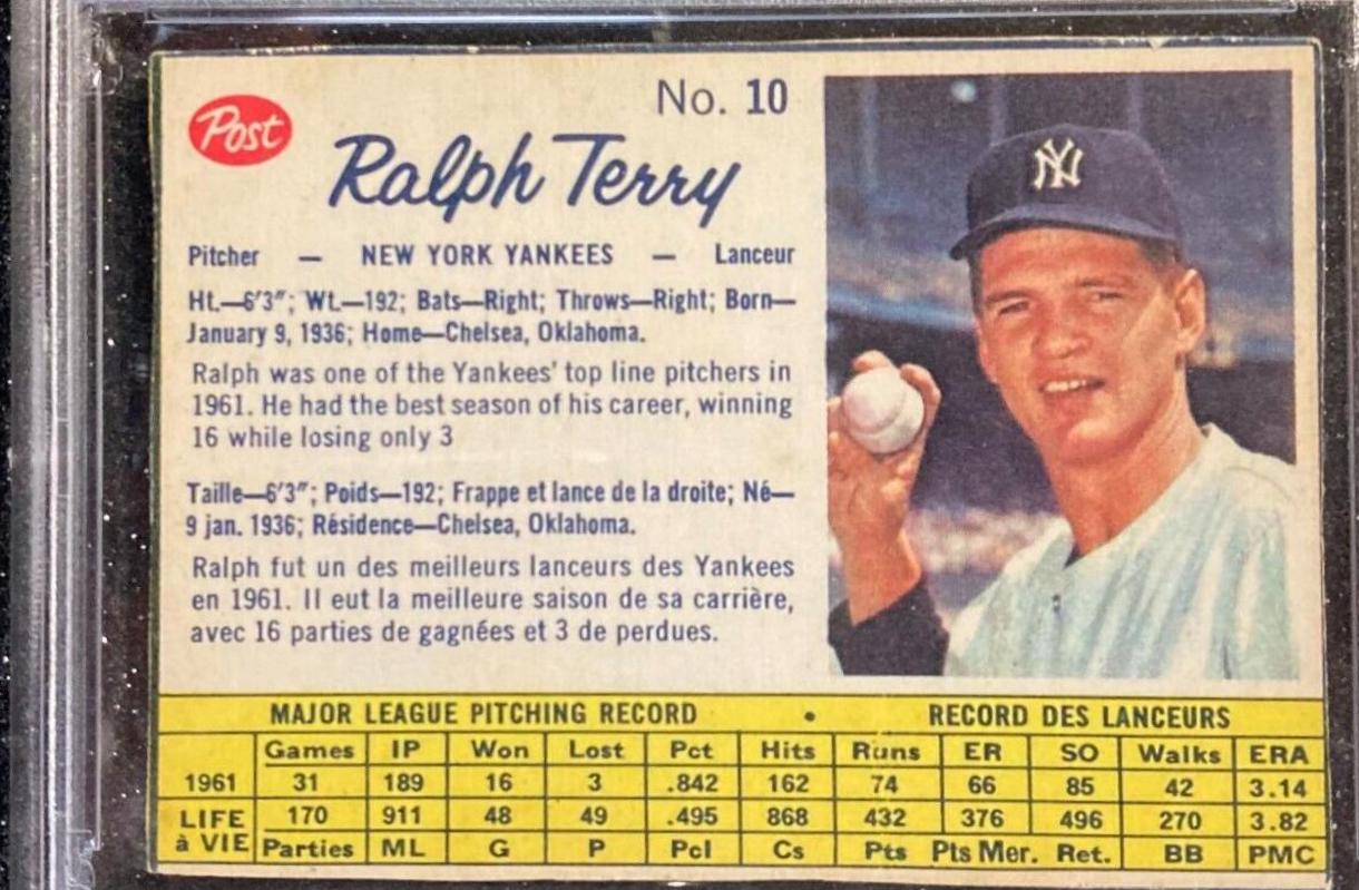 1962 Post Canadian Ralph Terry Hand Cut #10 New York Yankees (WS MVP) PSA 5 EX #10 [eBay] | $79.99 |