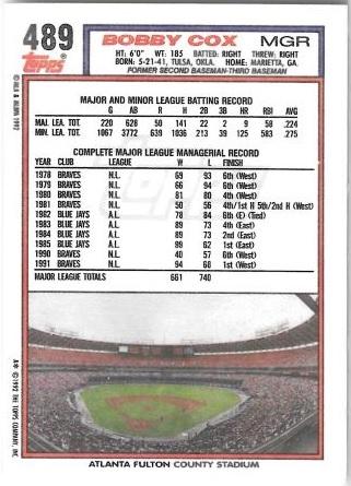 Bobby Cox #489 (1992 Topps) Details